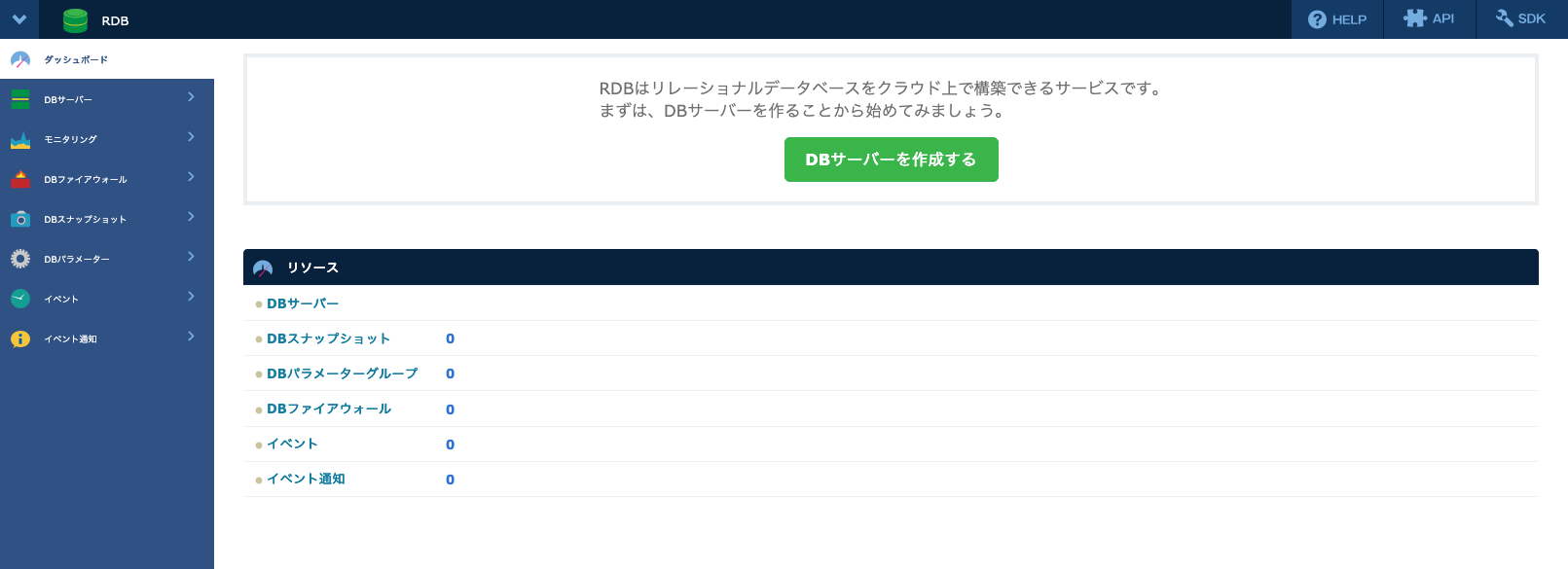 RDBのダッシュボードが開いたら「RDBサーバーを作成する」ボタンをクリックします。