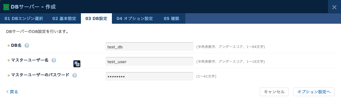 - DBサーバー名: DBサーバーのインスタンスにつける固有の名前です。わかりやすい名前をつけておきましょう。