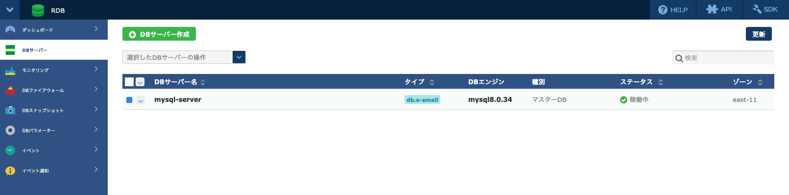 RDBのダッシュボードを開き、前述の手順で作成されたデータベースサーバーを選択します。