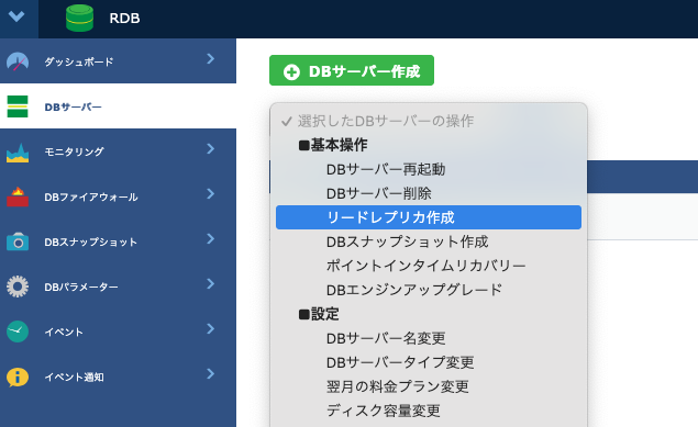 「選択したDBサーバーの操作」のプルダウンから、「リードレプリカ作成」を選択します。