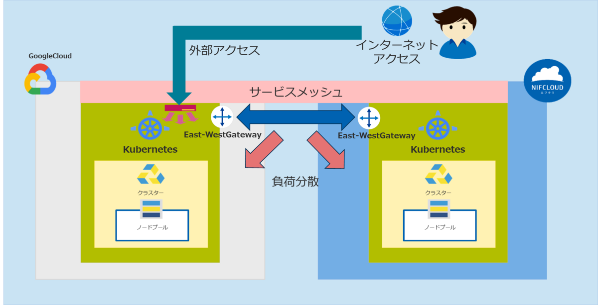 第1回、第2回、第3回で構築したマルチクラウド環境のマルチクラスタメッシュ(他社サイトリンク)構成にしたKubernetesクラスタで負荷分散を確認する検証を実施します。