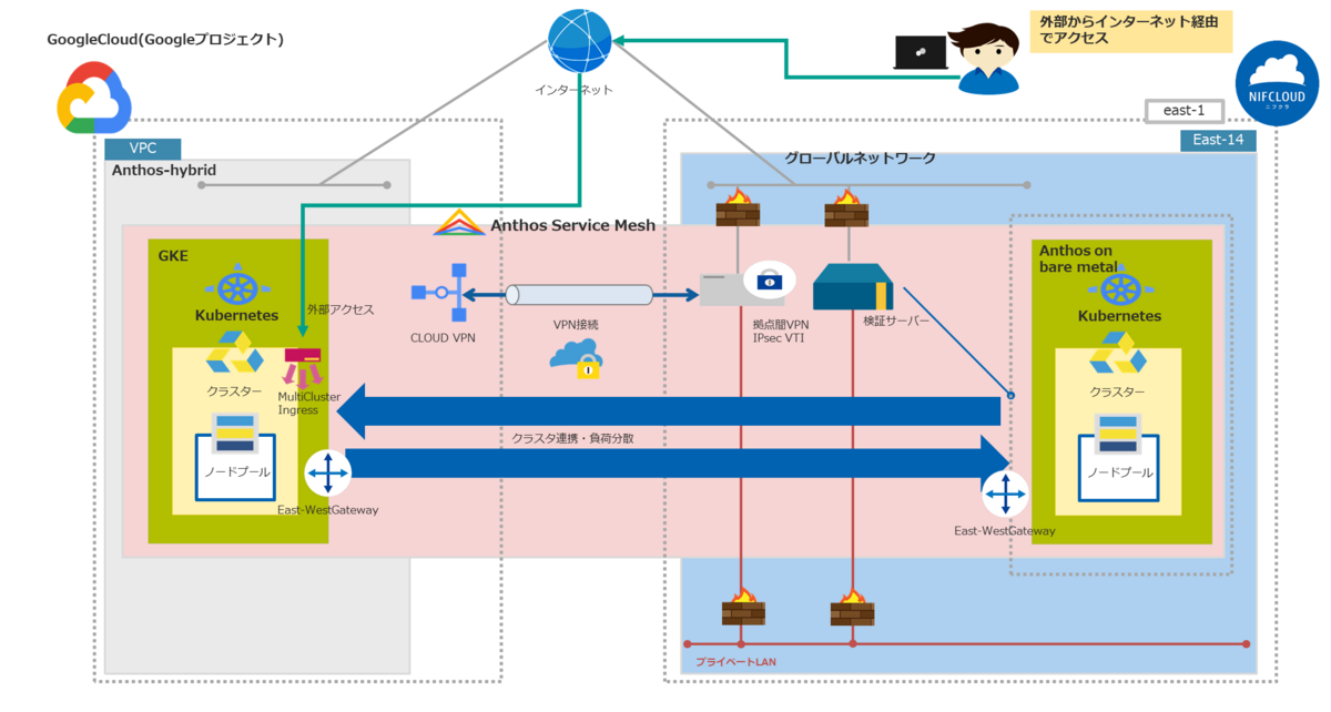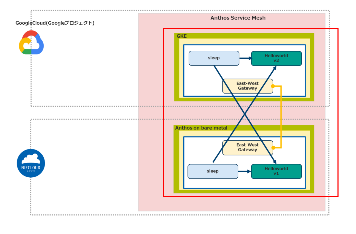 マルチクラスタメッシュになっているFJcloud-V(旧ニフクラ)とGoogleCloud間の疎通確認を実施します。