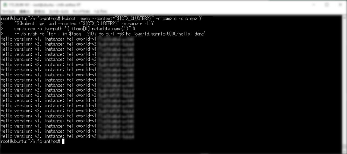 ①. マルチクラスタメッシュのロードバランシングが稼働してFJcloud-V(旧ニフクラ)とGoogleCloudのKubernetesクラスタ間で負荷分散されているかを確認します。