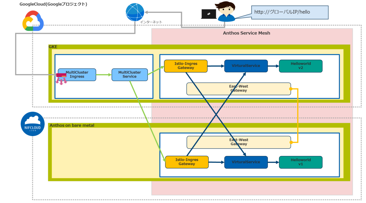 - インターネットからアクセスするために外部ロードバランサーとしてMultiClusterIngress・MultiClusterService(他社サイトリンク)をGoogleCloud環境に作成します。