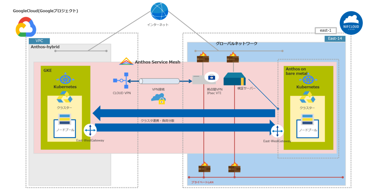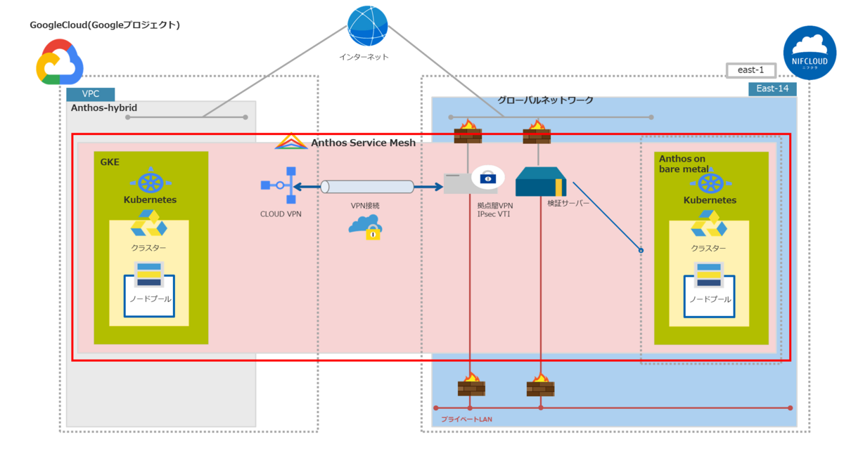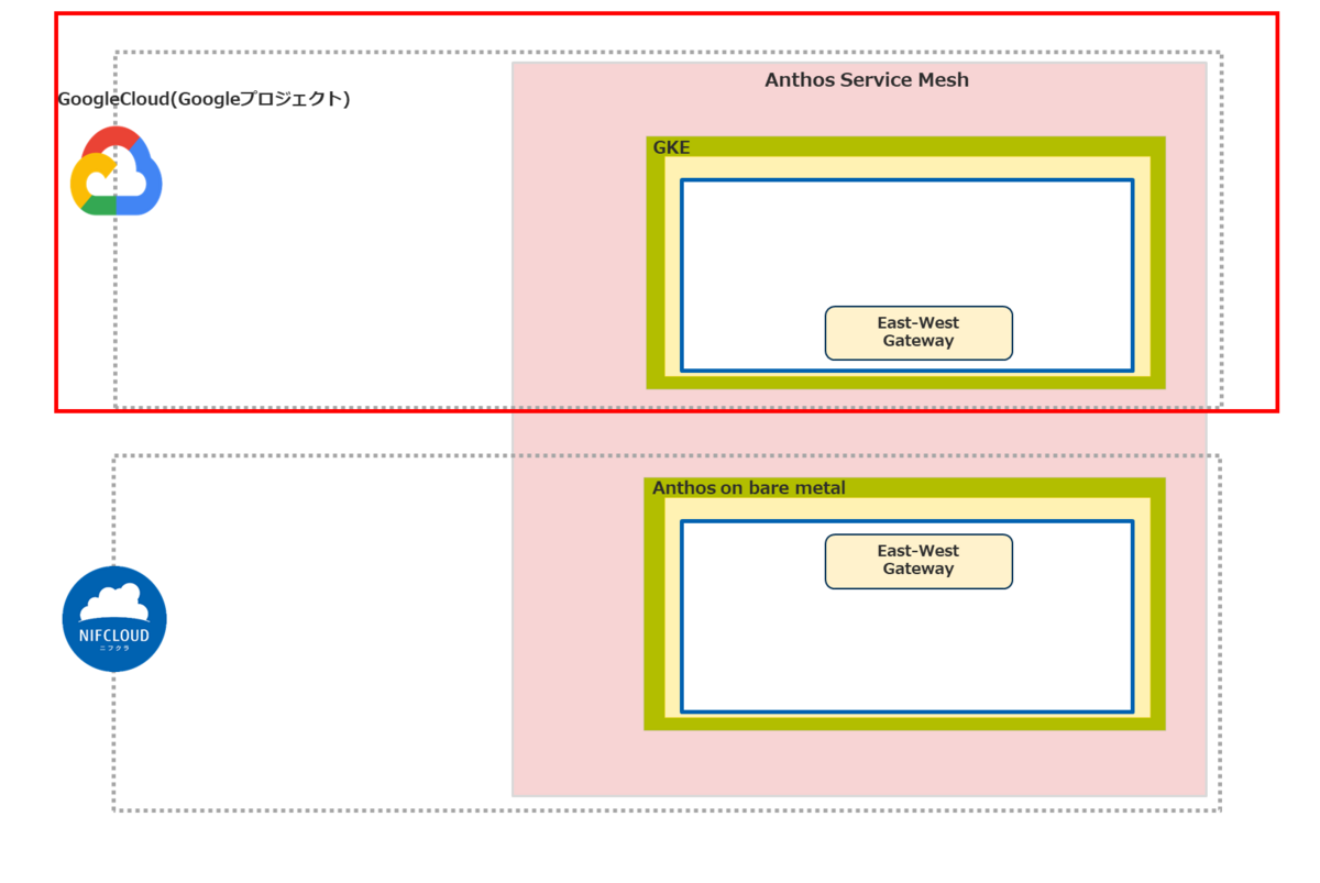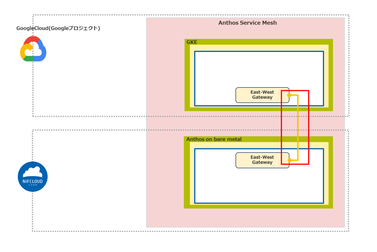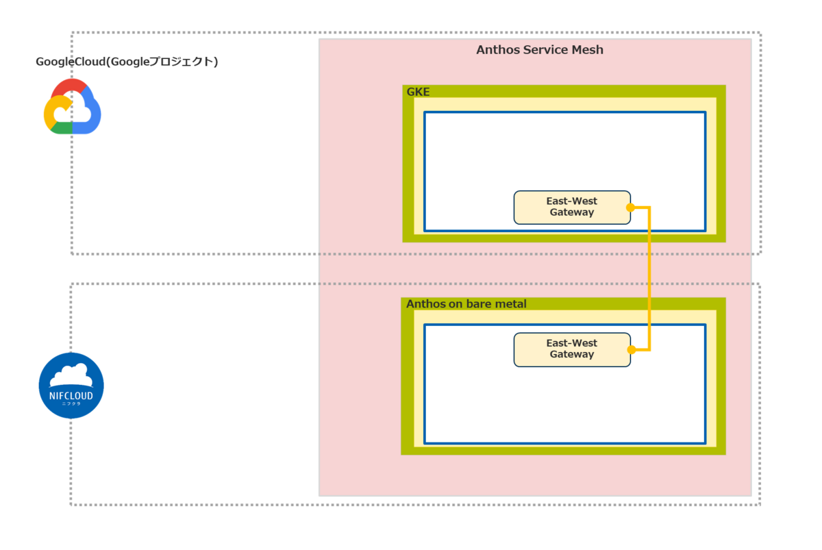 今回はFJcloud-V(旧ニフクラ)とGoogleCloudのKubernetesクラスタをIstioベースのAnthos Service Mesh(ASM)(他社サイトリンク)を利用してマルチクラウド環境間で負荷分散するマルチクラスタメッシュ(他社サイトリンク)構成を構築します。