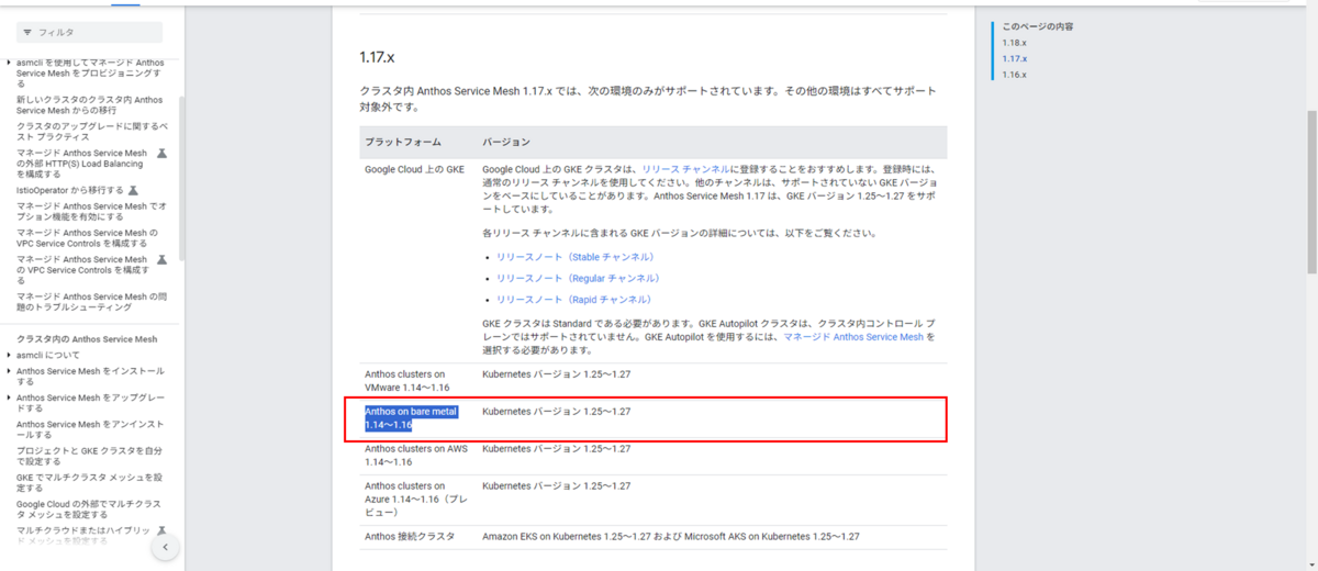 対応プラットフォーム(他社サイトリンク)で実行環境のAnthos on bare metalに対応しているASMバージョン(下図赤枠部分)を確認します。