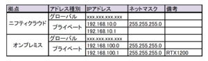 IPsecでL3接続と決まりましたので、それぞれのプライベートネットワークに別々のIPアドレスが割り当てられます。必要となるIPアドレスを表などにまとめておきます。