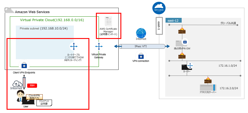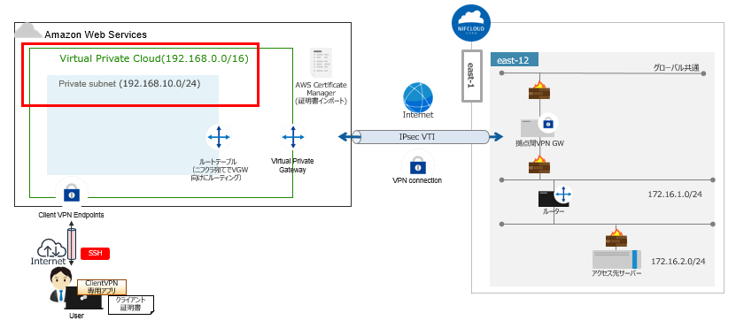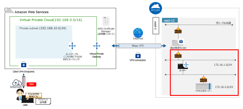 本構成は、クライアント端末からAWSのクライアントVPNエンドポイント・Amazon Virtual Private Cloud・IPSec VTIを経由し、FJcloud-V(旧ニフクラ)のネットワーク に接続可能な構成となります。