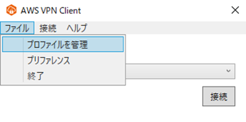 (1) AWS VPN Clientを起動し「ファイル」>「プロファイルの管理」>「プロファイルを追加」から以下設定を行います。