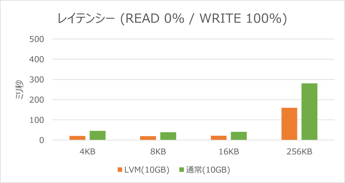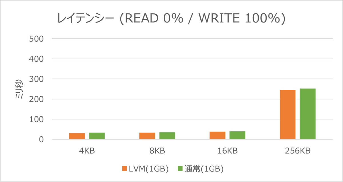 レイテンシーでは、LVM構成のディスクと通常のディスクでほとんど差がみられない結果となりました。