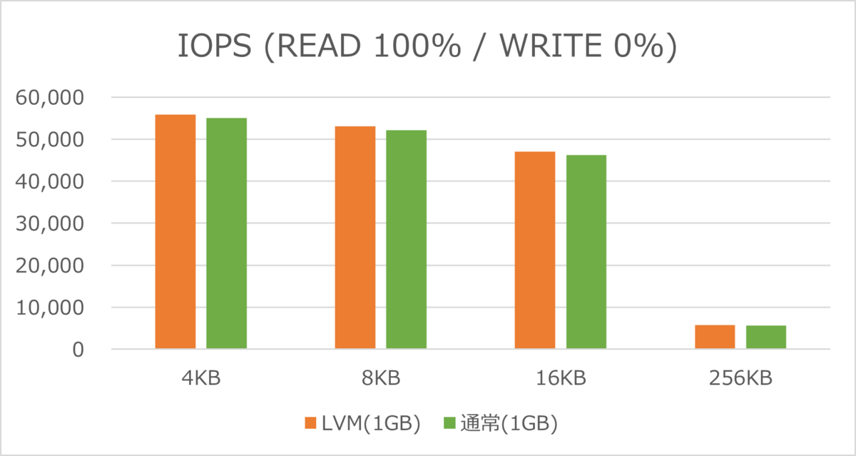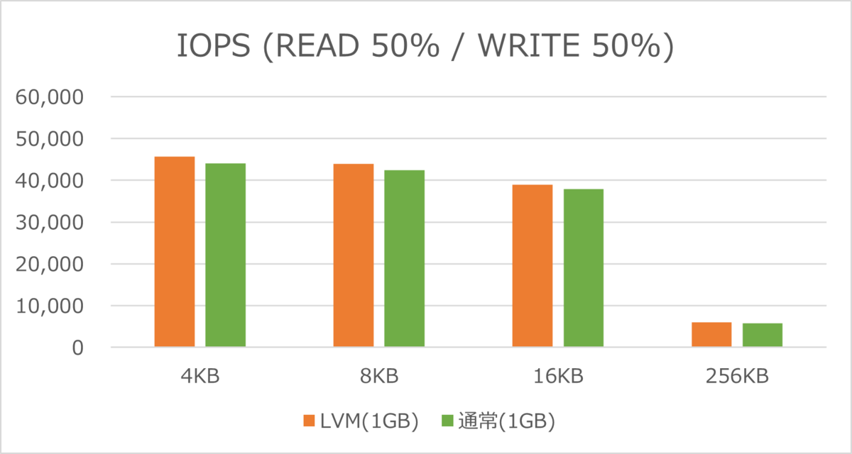IOPSでは、LVM構成のディスクの方が少しですが数値が高い結果となりました。