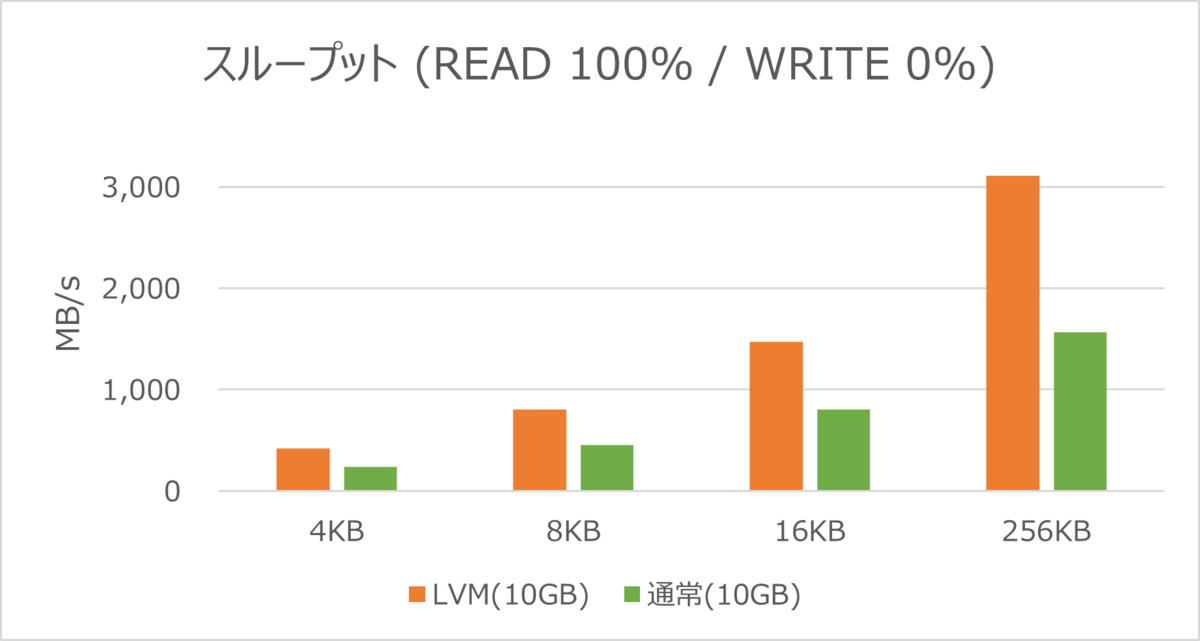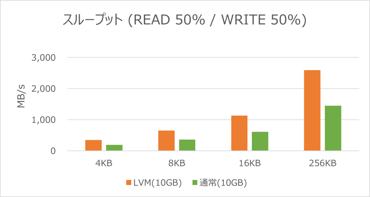 スループットでも、LVM構成の論理ボリュームの方が数値が高い結果となりました。