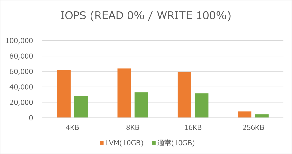 IOPSでも、LVM構成の論理ボリュームの方が数値が高い結果となりました。