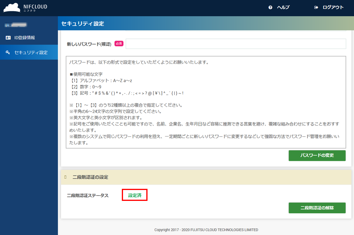 二段階認証のステータスが「未設定」から「設定済」に変わります。