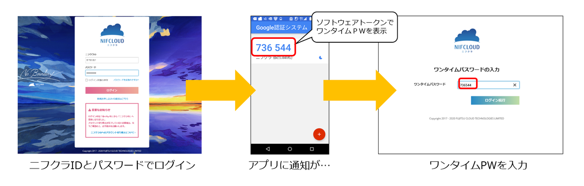 さらに、ニフクラのログイン画面にワンタイムパスワードの入力を求めるダイアログが表示されます。