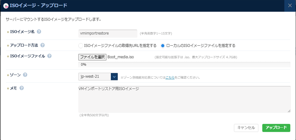 1本かつ、2TB(リージョンによっては1TB)までにしてください。タイプはThinにしてください。 - 詳細はクラウド技術仕様/制限値(コンピューティング:VMインポート)を参照してください。