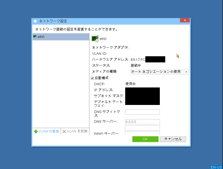 IPアドレスはDHCPで付与されているので変更せず、DNSサーバーを設定します。(画面サンプルでは8.8.8.8を設定しています。)