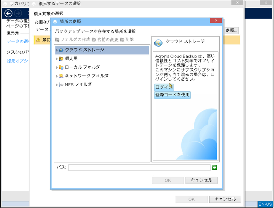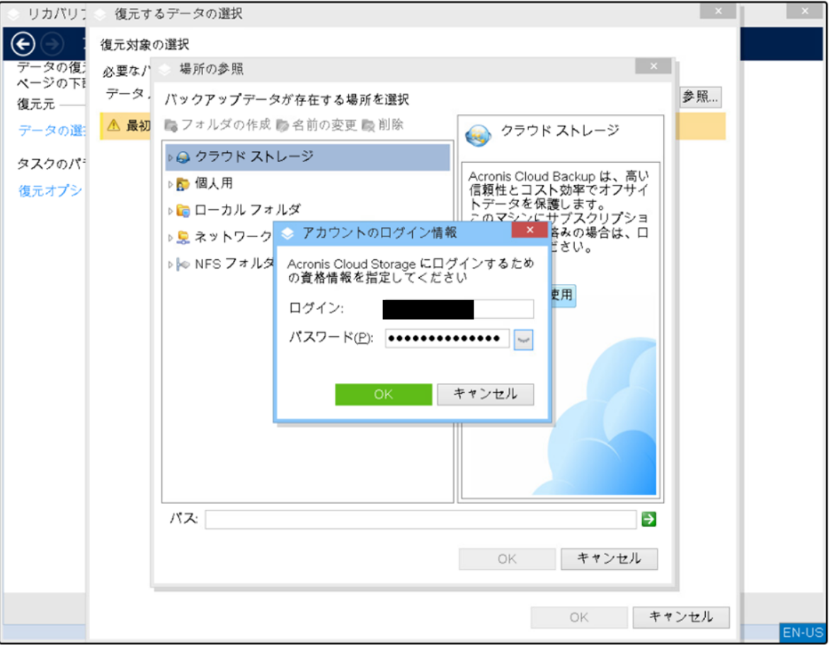 「クラウドストレージ」→「ログイン」を選択し、Acronis管理コンソールにログインするIDとパスワードを入力します。