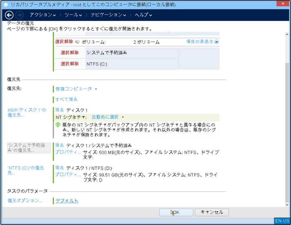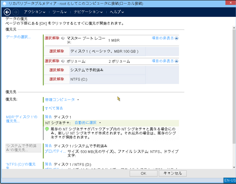 今回は元のサーバーと同じディスクを用意しましたが、インポートする元となるサーバーにてAcronisがファイルシステムサイズの変更に対応しているファイルシステムを利用しており、実データサイズがディスクサイズ以下の場合、サイズが小さいディスクへの復元も可能です。