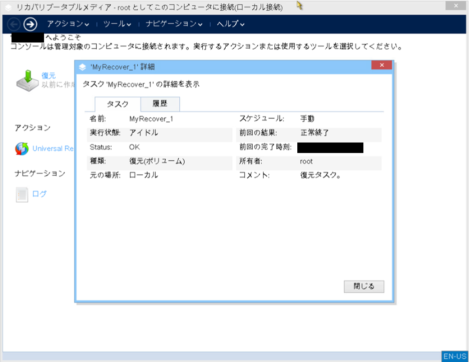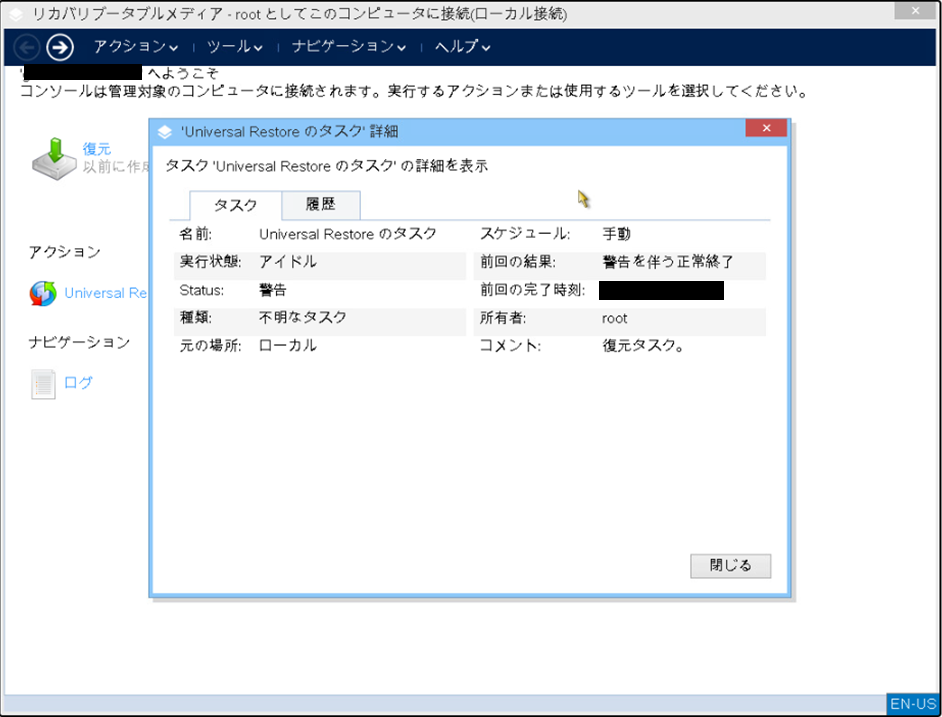 「OK」を選択すると、Universal Restoreが開始されます。前回の結果が「正常終了」を含む表示になれば完了です。