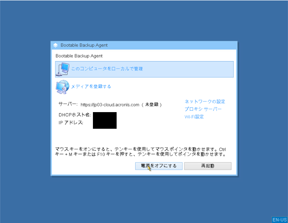 - 再度、Acronisの復元用ISOファイルをサーバーに接続し、起動します。このときBIOSの設定を戻していなければ「BIOS/UEFI画面で停止する」のチェックは不要です。