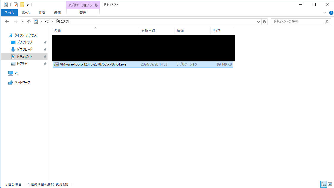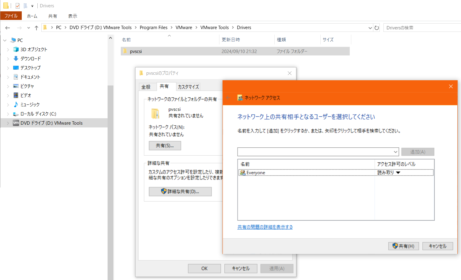 ダウンロードしたISOファイルをエクスプローラーで開き、「[ISOマウントドライブ]:\Program Files\VMware\VMware Tools\Drivers\pvscsi」を、Windowsの機能で共有します。