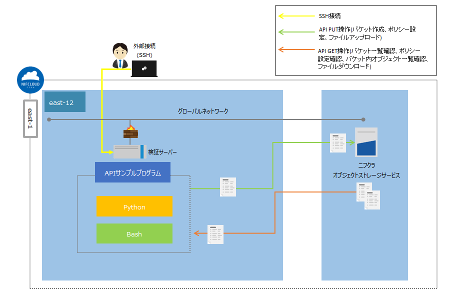 ニフクラ上に構築した検証サーバーに外部からSSH接続後、検証サーバー上のAPIプログラム(Python、Bash)を実行して