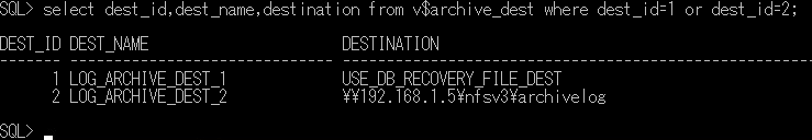 SQL> select dest_id,dest_name,destination from v$archive_dest where dest_id=1 or dest_id=2;