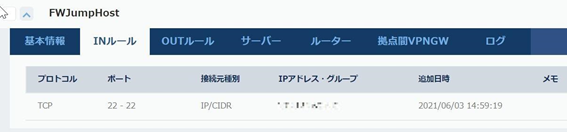 クライアント端末からSSH接続するために、ファイアウォール(FWJumpHost)の設定でINルールでポート22番を許可します。