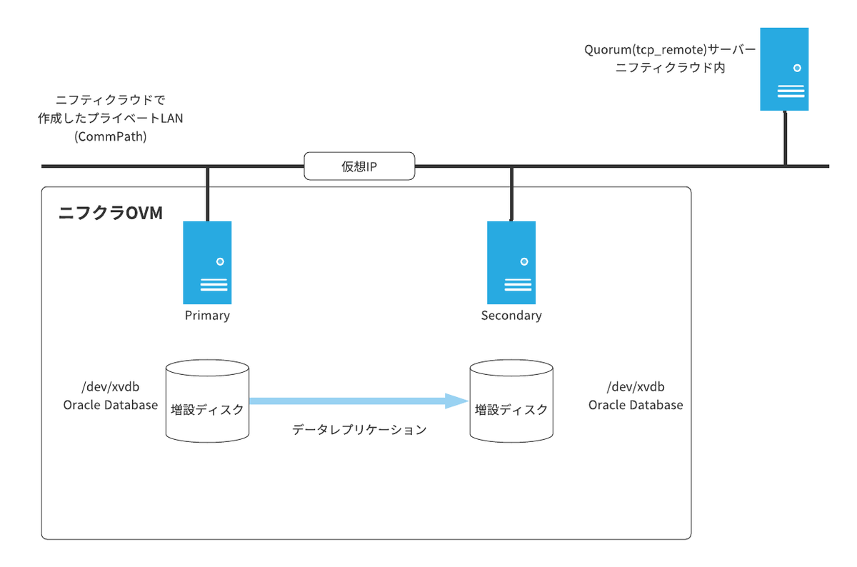 コミュニケーションパスは1本であるため、ニフクラにQuorum Server(tcp_remoteモード)を用意し、コミュニケーションパス切断時のsplit brainによるデータ破壊の問題を対策しています。