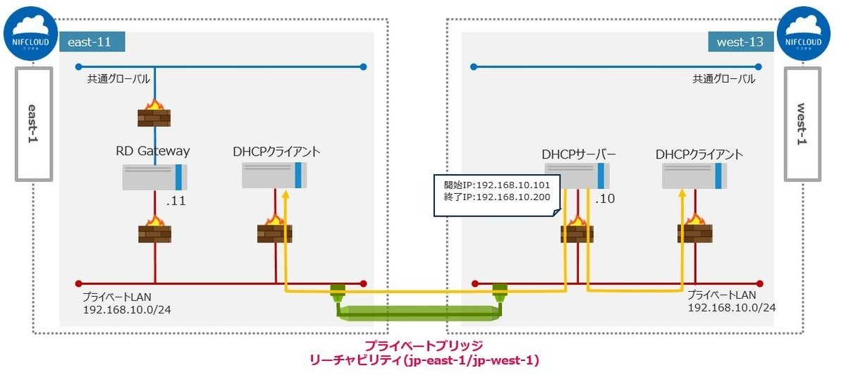 IPアドレスを自動で割り当てるサーバー(=DHCPクライアント)は、同じプライベートLAN上と、プライベートブリッジ(プライベートLAN同士を接続する機能)で接続した別リージョンのプライベートLAN上に作成します。
