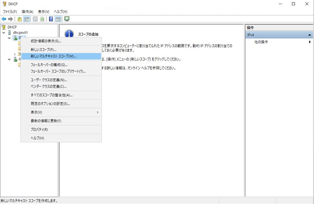 左メニューの「IPv4」を右クリックし、「新しいマルチキャスト スコープ」を選択します。