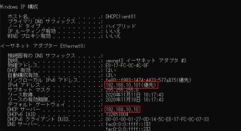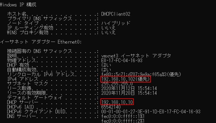 こちらもDHCPサーバーのスコープからIPアドレスが自動で割り当てられました。