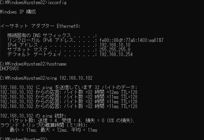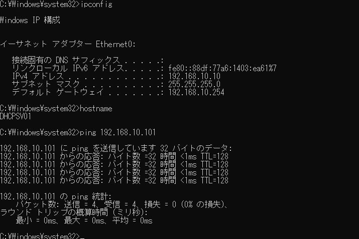 DHCPサーバーからPingコマンドで疎通できることを確認します。