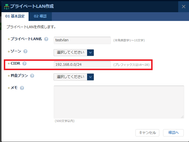プライベートLAN作成時には以下のようにCIDRを指定します。
