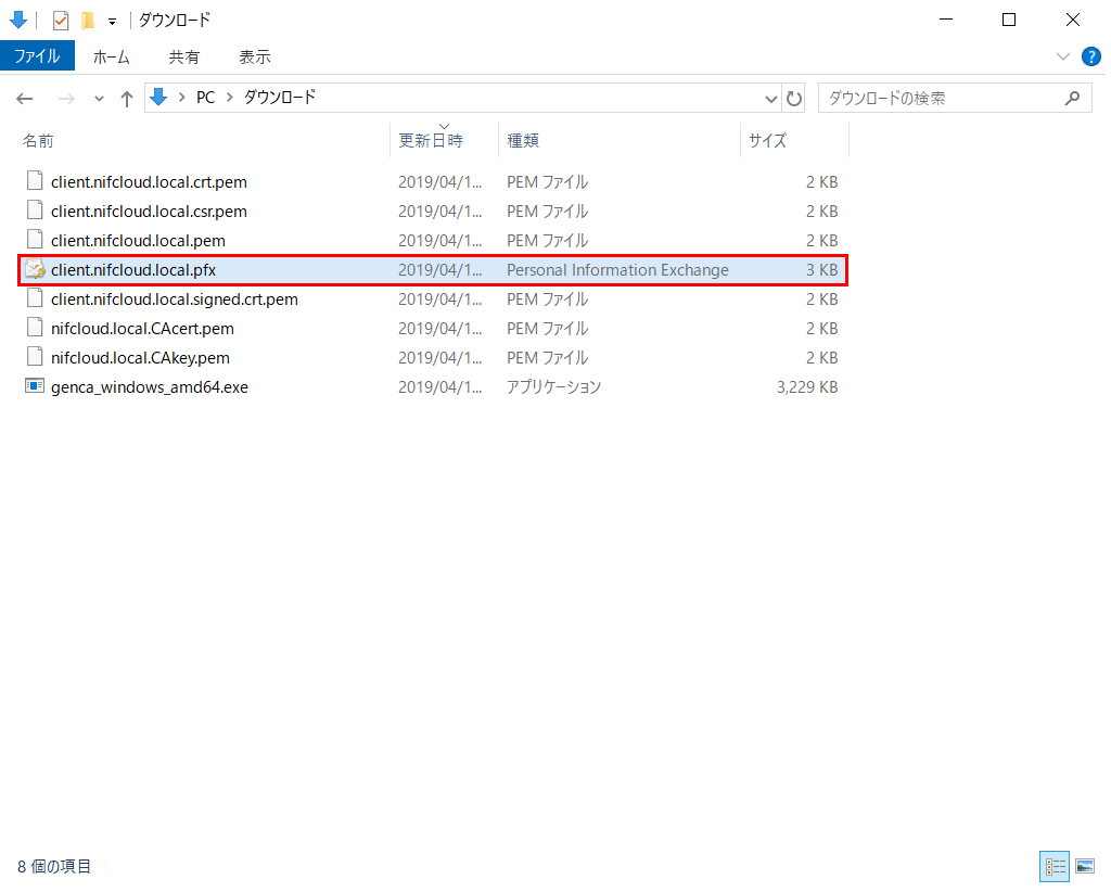 「client.nifcloud.local.pfx」を実行します。
