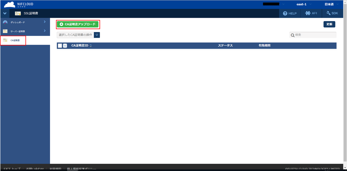 ここでは、FJcloud-Vのコントロールパネルから「CA証明書の作成」で作成したCA証明書をアップロードします。