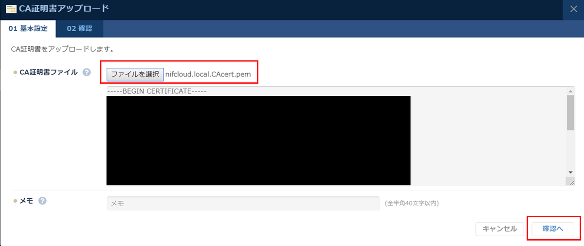 「ファイルを選択」をクリックし、作成した「nifcloud.local.CAcert.pem」を選択し「確認へ」をクリックします。