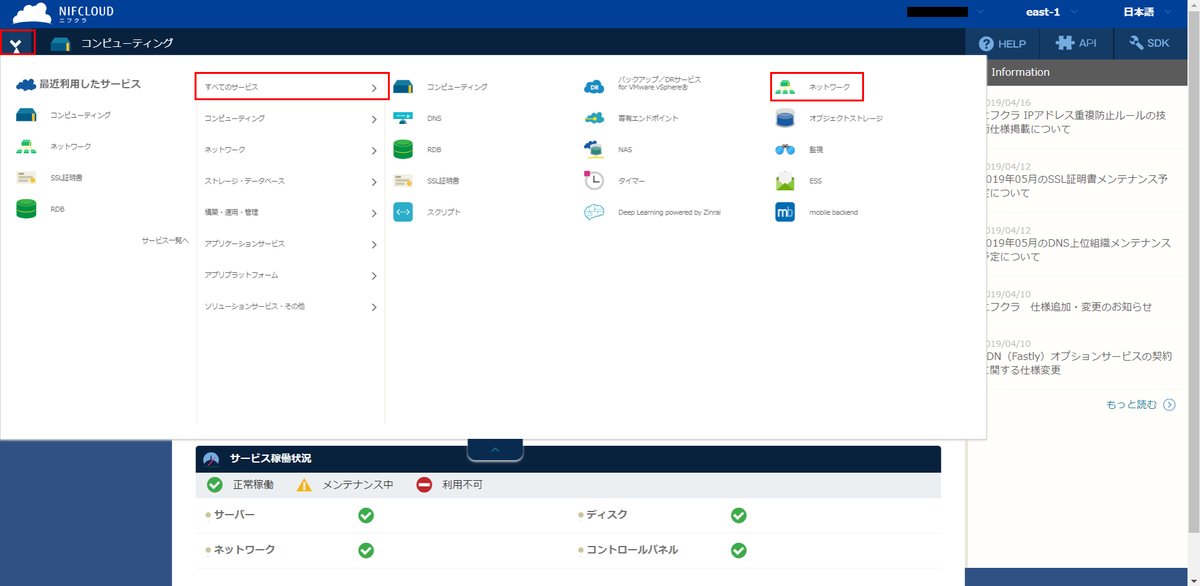 コントロールパネルの左上のメニューから「すべてのサービス」-「ネットワーク」をクリックします。