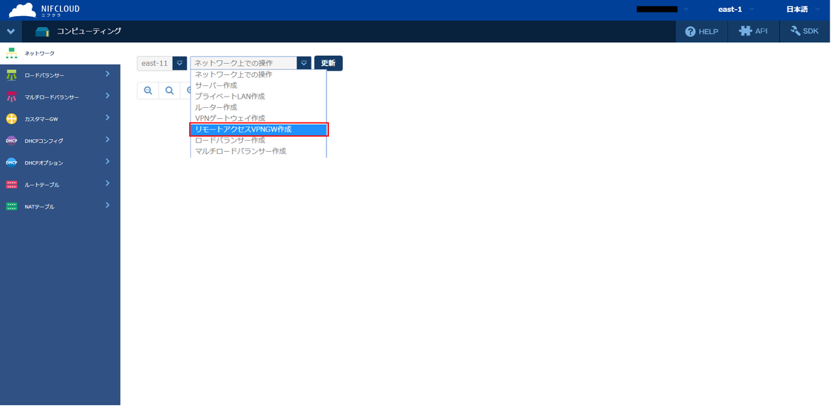 「ネットワーク上での操作」-「リモートアクセスVPNGW作成」を選択します。