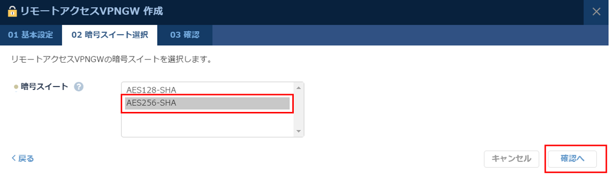 「AES256-SHA」を選択し「確認へ」をクリックします。