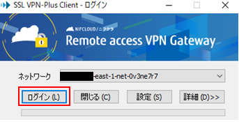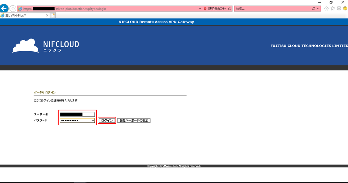 ユーザー作成(VPN接続用)で設定した「ユーザー名」と「パスワード」を入力し、「ログイン」をクリックします。