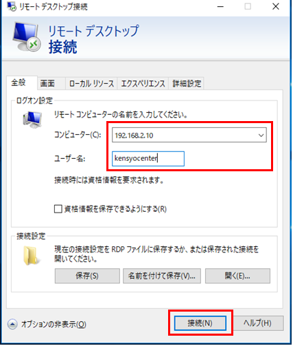 作業端末からリモートデスクトップを起動し、接続先IPとユーザ名を指定し「接続」をクリックします。