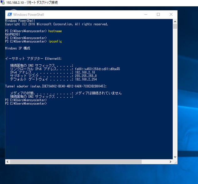 対象サーバーにログイン後、コマンドプロンプトを起動し「ipconfig」コマンドで確認します。
