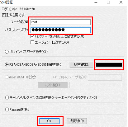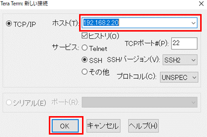作業端末からTeraTermを起動し、ログインに必要な項目を入力し「OK」を選択します。