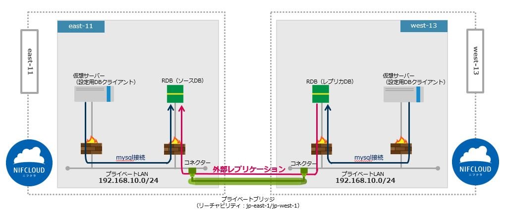 今回は、別リージョンを利用したRDBのデータ保全を、より高速かつセキュアに行って可用性を高める目的で、ニフクラ クラウドデザインパターンの「3.【ネットワーク応用】ニフクラ クラウドデザインパターン」-「リージョン間接続パターン(プライベートブリッジ)」の構成を参考に、プライベートブリッジを利用して東西間でのRDB外部レプリケーション構成を実装してみます。
