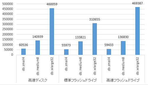- 標準フラッシュドライブはサーバータイプがdb.small4,db.medium8のときには他ディスクタイプと大きな性能差が無かったが、wlarge32のときは65~68%程度の性能となっている。