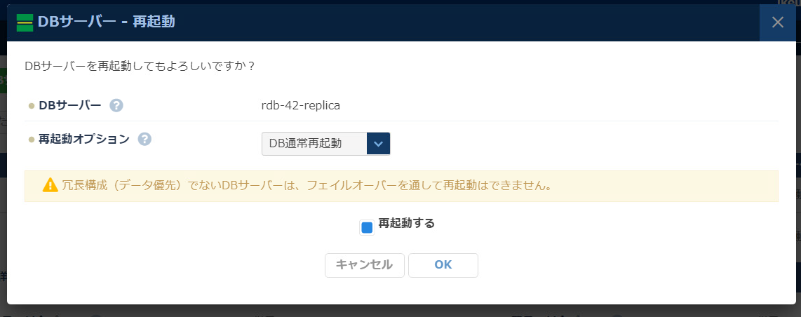 - 3\. リードレプリカ1台について、コントロールパネルより再起動を実施