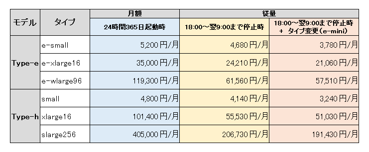 本比較表は、月額料金と従量で「18:00~翌9:00まで停止した場合」、「サーバー停止時にタイプ変更(e-mini)を行った場合」の利用料金を表しています。