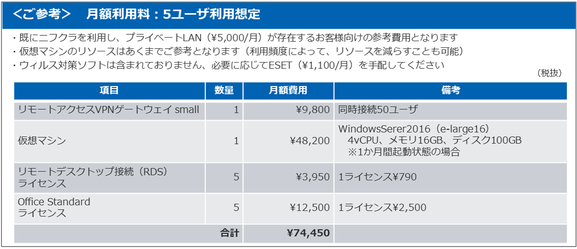 社員が新型コロナウイルスに感染して、全社員にテレワークの指示が出た有名企業のニュースを何度かご覧になったかと思いますが、テレワーク=大企業しかできないというイメージがあるようです。 ご参考ですが、5ユーザーを想定した試算をご覧ください。 まだニフクラを導入していない場合は、見積もりシミュレーターで簡単に試算可能ですので、ぜひご利用ください。